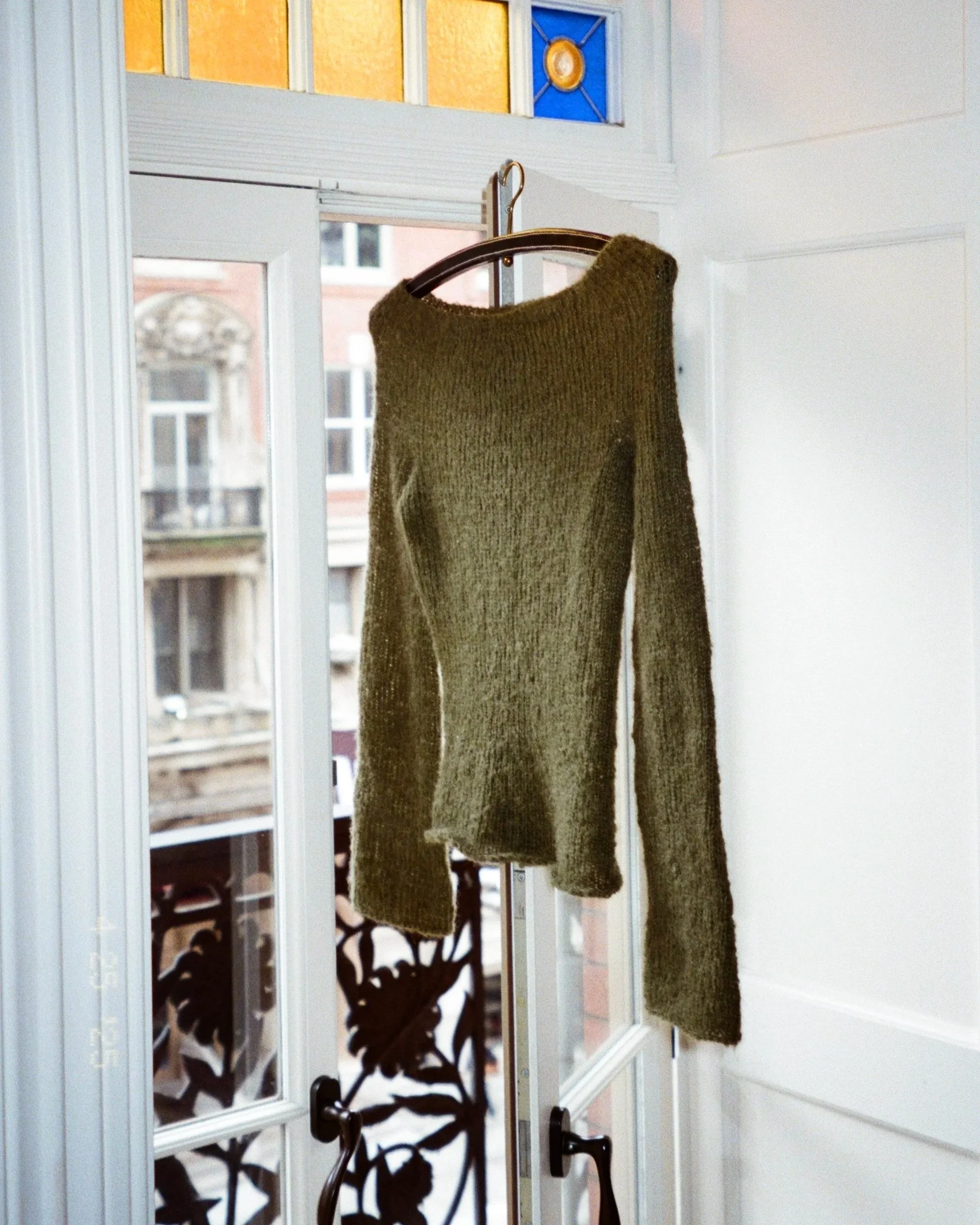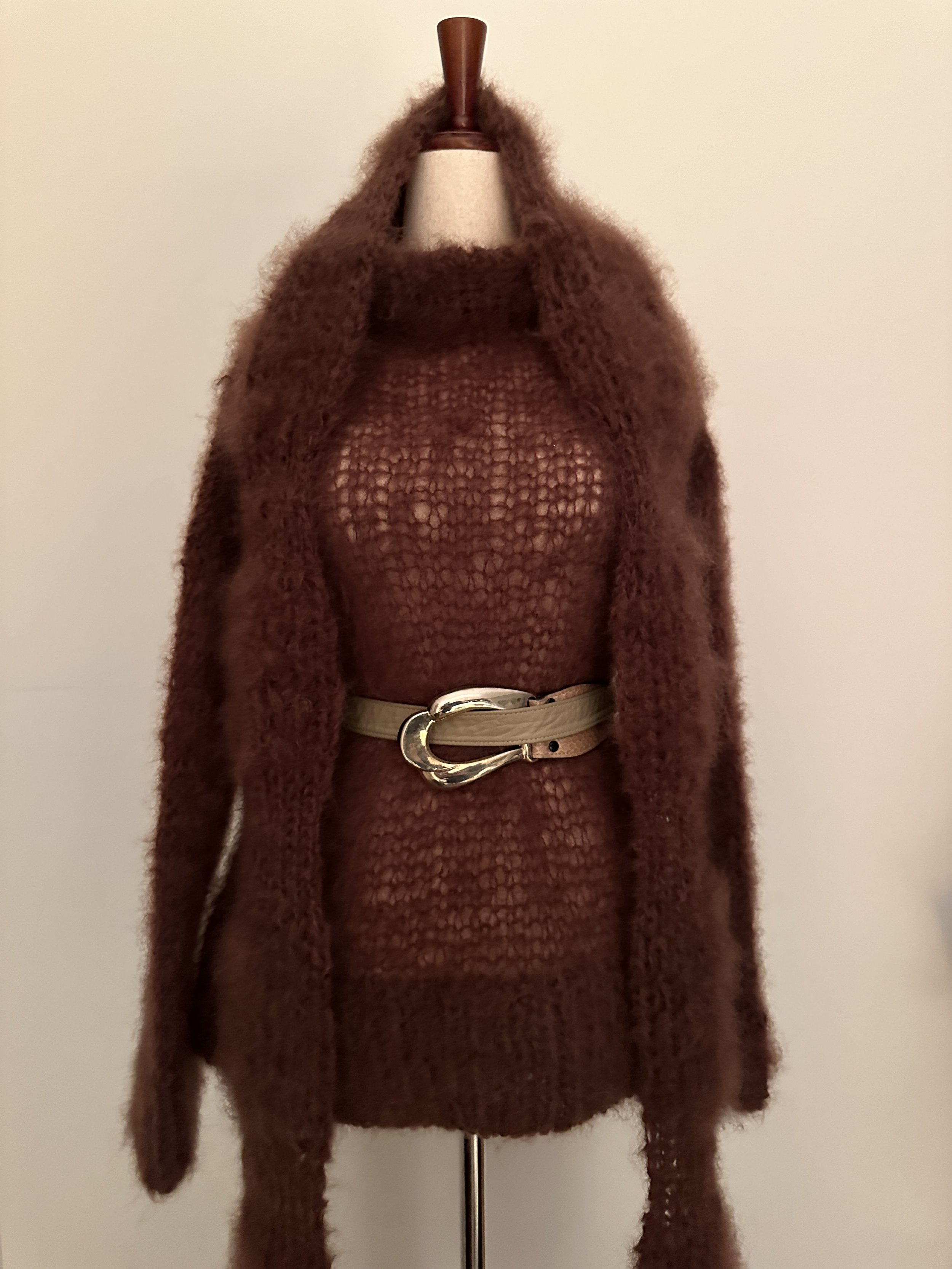 Baby Alpaca Fringe Poncho $750.00 Handmade Boatneck Top in Olive $375.00 The Jane Sweater $350.00 Sold out Handmade Mohair Sweater and Scarf in Chocolate $725.00 Sold out